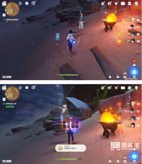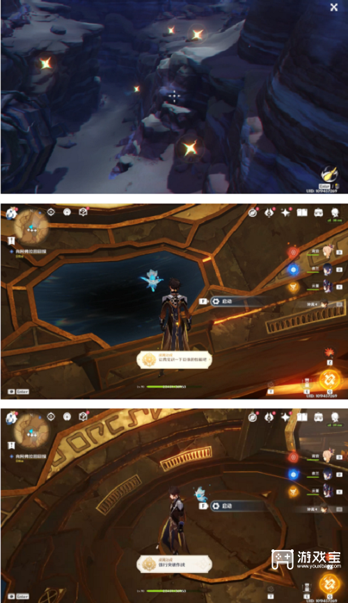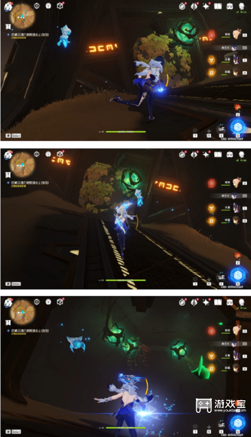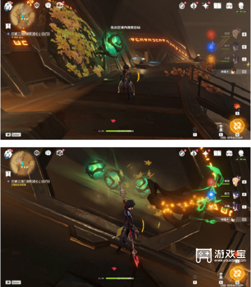 然后继续跟着任务指引来到三个封印面前 ,如果找不到石头可以开元素视野 ,打破第一组「须陀流心」,会出现一个小动画 ,然后右边的屏障击碎后,【强行突破作战】